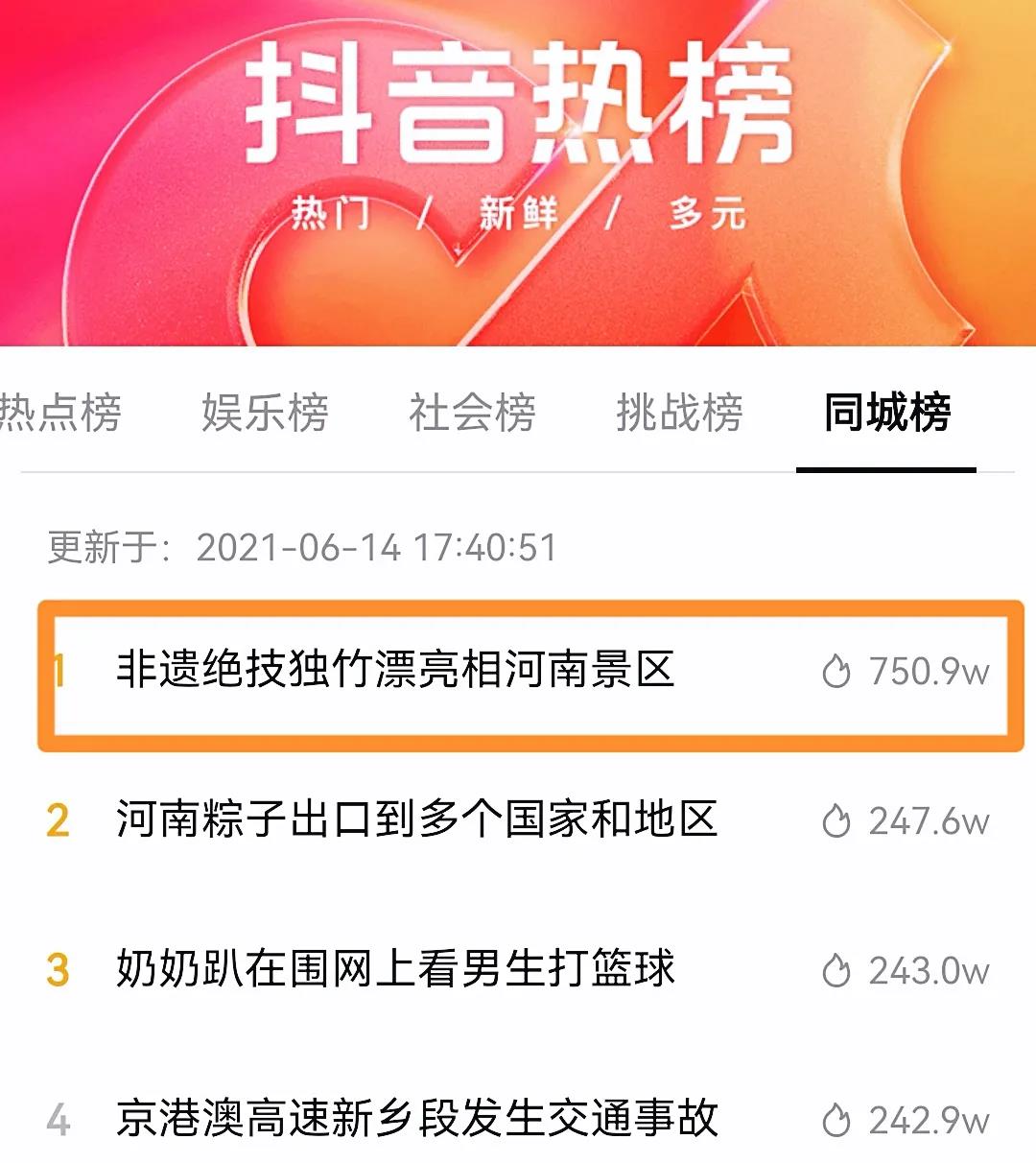 6月13日,熱點(diǎn)“非遺絕技獨(dú)竹漂亮相河南景區(qū)”沖上抖音熱搜同城榜,并連續(xù)兩天霸占抖音熱搜同城榜第一名。