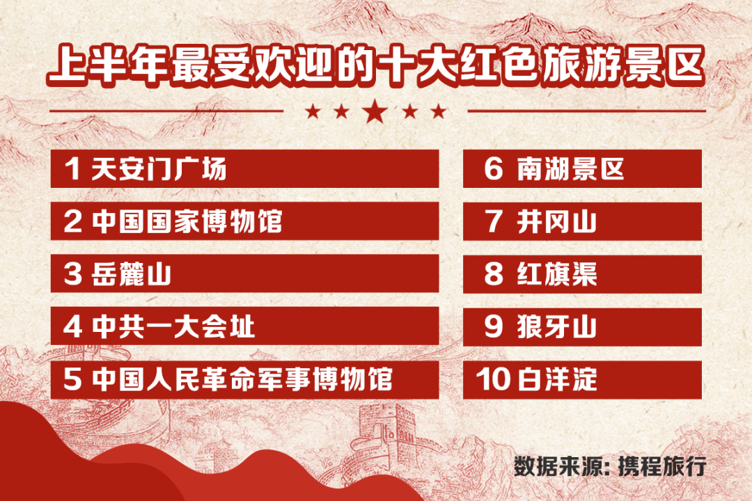 6月23日,攜程發(fā)布的《2021上半年紅色旅游大數(shù)據(jù)報告》顯示,上半年國內紅色旅游景區(qū)預訂量同比增長超2倍。其中,河南紅色游成了突出的亮點,安陽上榜最具人氣的紅色旅游目的地TOP10,一同上榜的有北京、南京、上海、長沙、延安、嘉興、遵義、韶山、南昌。另外,紅旗渠景區(qū)與天安門廣場、中國國家博物館、岳麓山、中共一大會址、中國人民革命軍事博物館、南湖景區(qū)、井岡山、狼牙山和白洋淀等,一起上榜了上半年最受歡迎的十大紅色旅游景區(qū)。