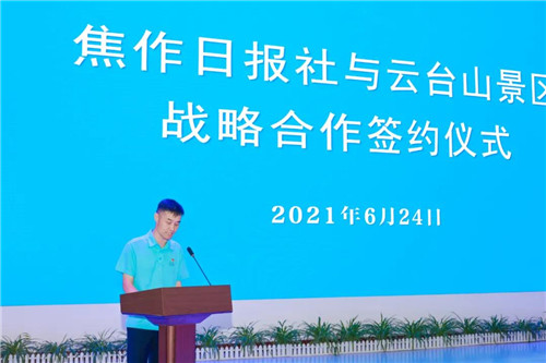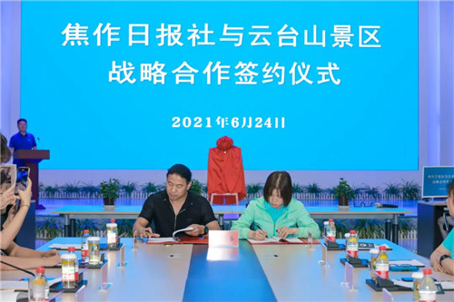 焦作云臺(tái)山旅游發(fā)展有限公司副總經(jīng)理、營(yíng)銷總監(jiān)吳沛萌焦作日?qǐng)?bào)社教育事業(yè)部主任李濤代表雙方簽署合作協(xié)議。