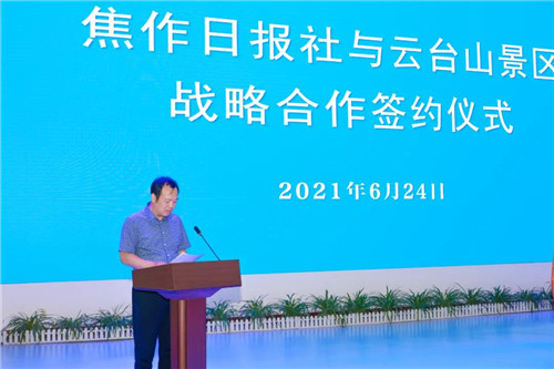 焦作日?qǐng)?bào)社黨委副書記、總編輯王靜鋒發(fā)表致辭,他表示此次雙方簽訂小記者研學(xué)教育和中小學(xué)生研學(xué)旅行戰(zhàn)略合作協(xié)議,是報(bào)社轉(zhuǎn)型提升、融合發(fā)展的良好機(jī)遇,是景區(qū)進(jìn)一步精準(zhǔn)拓展研學(xué)市場(chǎng)的良好機(jī)遇。焦作日?qǐng)?bào)“黨報(bào)品牌”+云臺(tái)山“山水名片”必將攜手書寫新時(shí)代焦作高質(zhì)量發(fā)展“紅綠”融合新篇章!儀式由焦作日?qǐng)?bào)社新媒體中心暨旅游部主任王晨光主持。