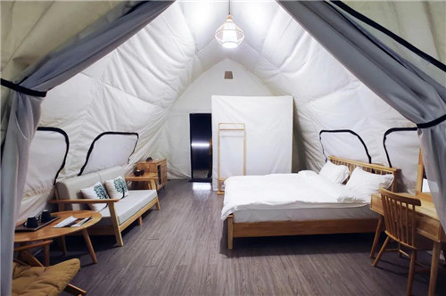 原木地板和純白的屋體,搭配簡(jiǎn)約的家具,讓整個(gè)空間都倍感清新,氣氛極其浪漫,無(wú)論是躺在床上,坐在沙發(fā)上,往外看就是山谷,可以說(shuō)是自然的野性與設(shè)施服務(wù)的精致融為一體,用帳篷打造與世隔絕感和更純粹的自然體驗(yàn)。
