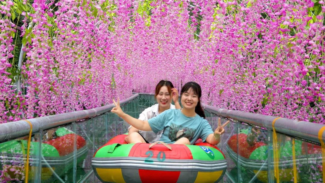 追夢谷暢玩叢林漂流,叢林漂流全長1800米,落差66米。沿途將帶您穿過時光隧道、滿天星、星空、風車、紫藤長廊、風鈴、三層旋轉等特色體驗。