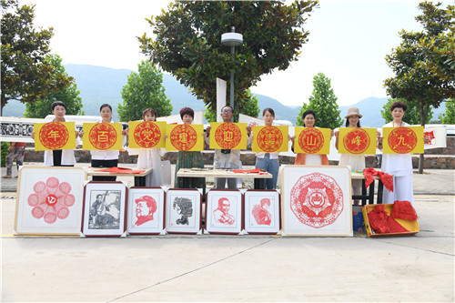 此外,大家還一同參觀了“學(xué)黨史,慶百年”科普展和百年光輝非遺剪紙藝術(shù)展,并在背景墻上留下祝福的話語表白和禮贊我們的黨、我們的國。結(jié)束之際,大家圍著這幅沙畫作品齊聲高唱“唱支山歌給黨聽”,嘹亮的歌聲直沖云霄。