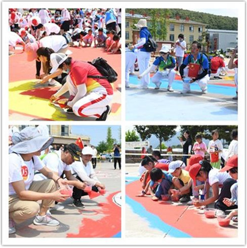 上午10點(diǎn),地面巨幅沙畫繪制正式開始。在景區(qū)創(chuàng)客安笛沙畫20名專業(yè)沙畫老師的引領(lǐng)下,由汝州市優(yōu)秀老共產(chǎn)黨員代表灑下第一捧彩沙。