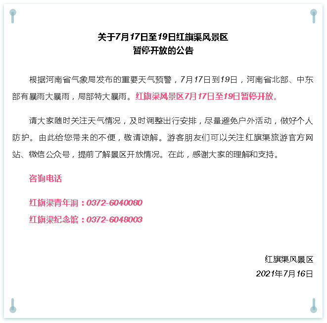 您的當(dāng)前位置:網(wǎng)站首頁(yè) > 出行資訊 > >關(guān)于7月17日至19日紅旗渠風(fēng)景區(qū)暫停開放的公告