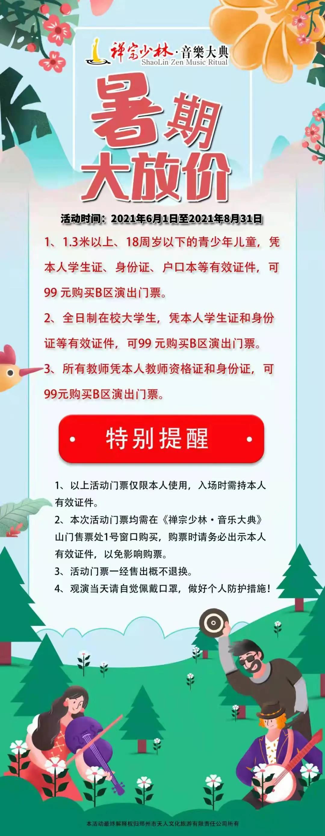 2021年7月10日—9月10日,憑重渡溝、雞冠洞、老君山景區(qū)購(gòu)票憑證,于每晚7點(diǎn)前在《禪宗少林·音樂(lè)大典》景區(qū)售票處2號(hào)窗口,購(gòu)買B區(qū)及以上區(qū)域演出門(mén)票,可立減50元(一張門(mén)票僅限使用一次,不可與其他活動(dòng)同時(shí)使用)。