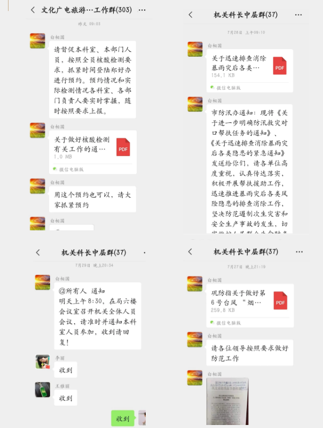 辦公室作為一個(gè)單位的綜合服務(wù)部門,承擔(dān)著上傳下達(dá)、多方溝通的職責(zé),辦公室主任既是單位的協(xié)調(diào)員,又是戰(zhàn)斗員,白相國同志因傷雖不能親自到前線作戰(zhàn),依然通過工作群協(xié)調(diào)局各項(xiàng)工作。