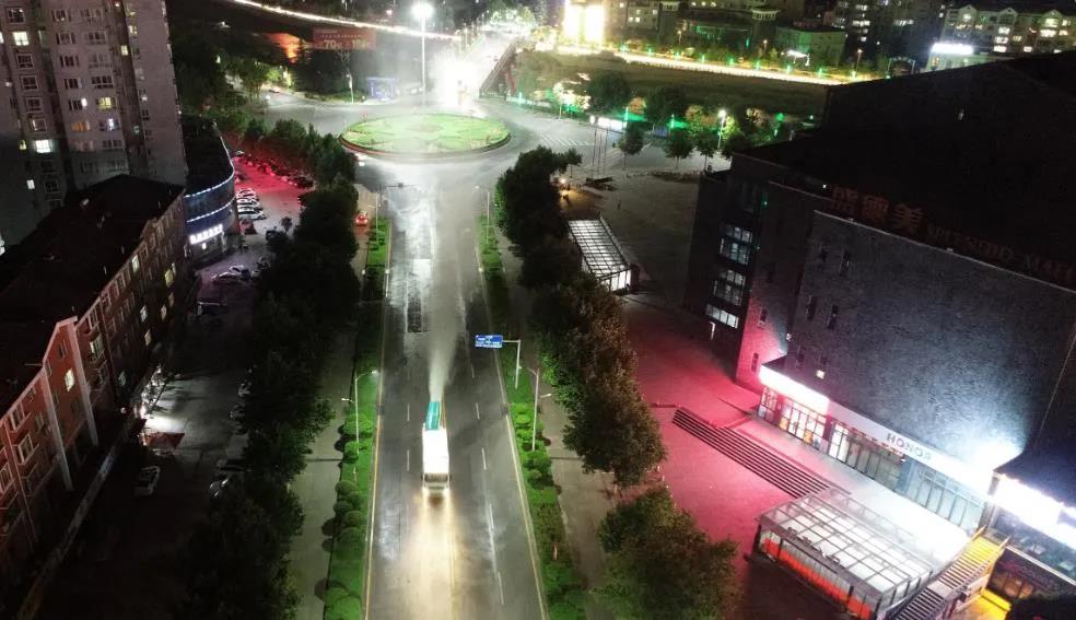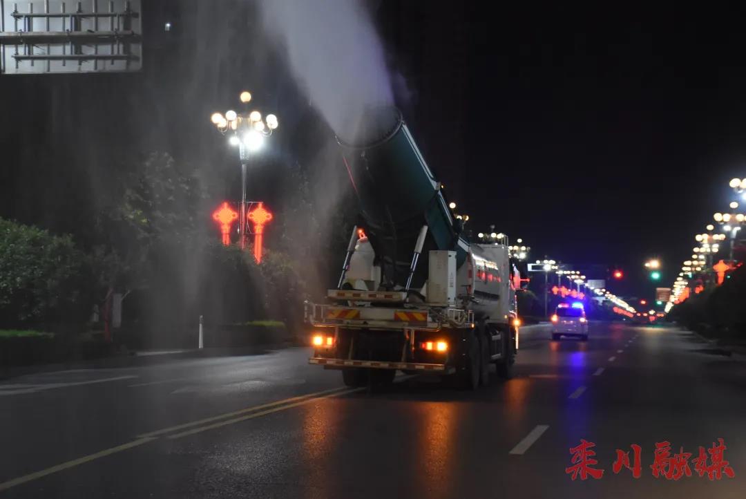 22時,伊水路多臺環(huán)衛(wèi)霧炮車輛集結(jié)完畢,一聲令下,消毒車輛沿著伊水路、君山路、濱河大道等城區(qū)主次干道噴灑消毒液。霧炮車經(jīng)過,密集的水霧就像細雨落下,灑下的消毒水是經(jīng)過科學(xué)配比的低濃度(84)消毒液,對人畜無害。