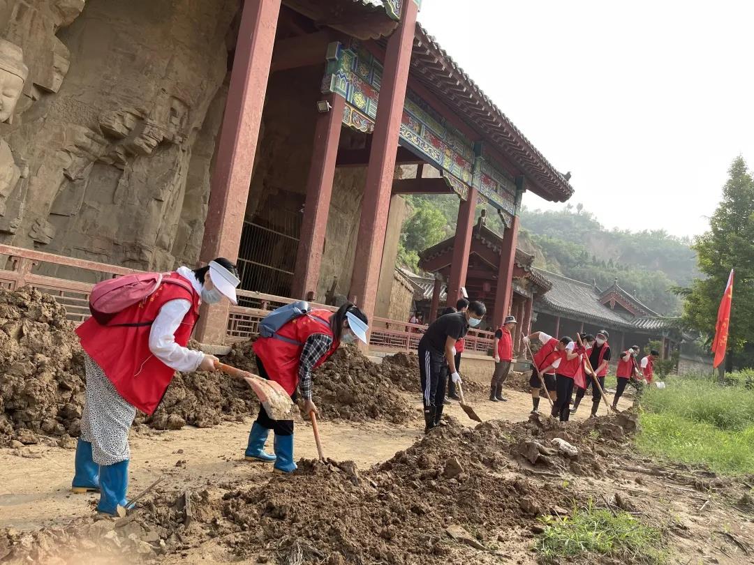 特大暴雨之后,全國(guó)重點(diǎn)文物保護(hù)單位石窟寺內(nèi)淤泥遍地,道路面目全非。“人在,文物在!”8月14日-17日,鞏義文廣旅體系統(tǒng)100多名干部、職工頂著高溫天氣,奔赴石窟寺,開(kāi)展災(zāi)后重建工作。志愿者們挽起褲腿,拿起鐵锨,清理石窟寺淤泥,疏通道路。經(jīng)過(guò)持續(xù)奮戰(zhàn),景區(qū)多條道路及5個(gè)石窟的淤泥清理完畢,石窟寺再展芳容。