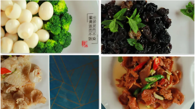 鹿茸炒肉、清炒靈芝菇、涼拌核桃菌、