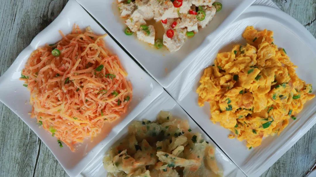 蒸紅蘿卜絲、調(diào)豆腐、生爆雞胗、