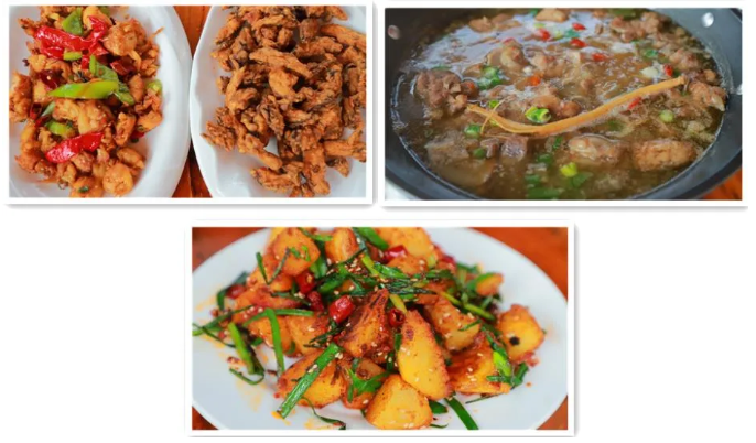 燒猴頭、炒土雞、烙土豆、山竹筍炒肉、