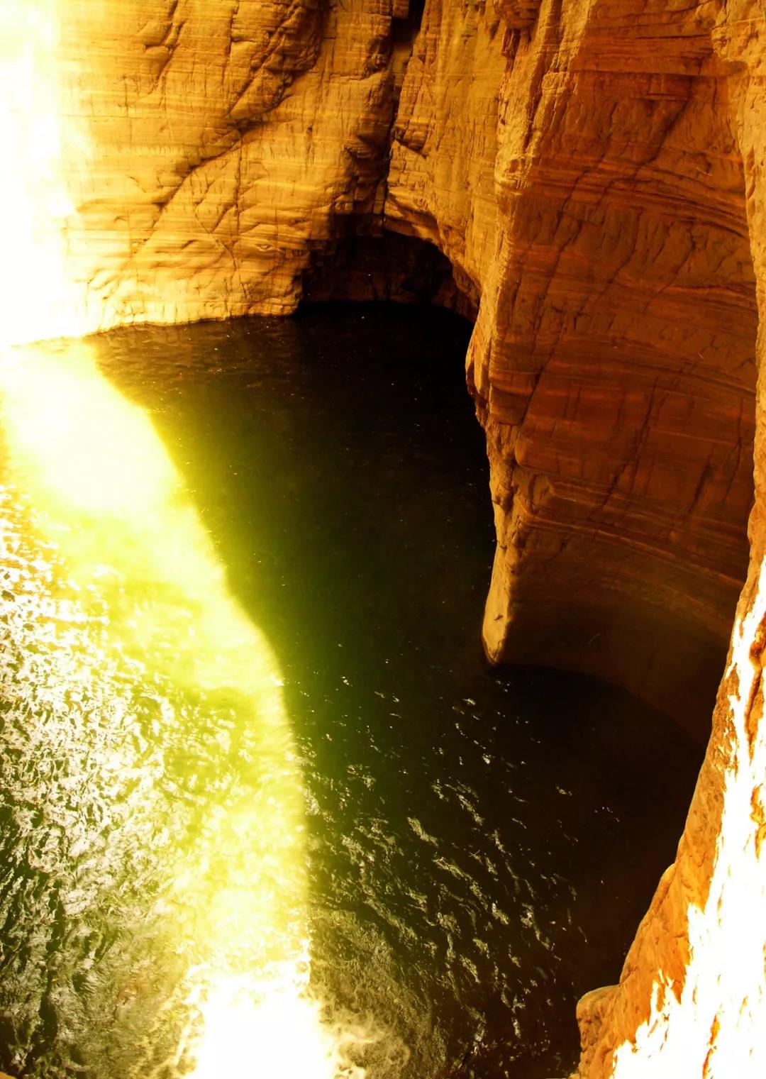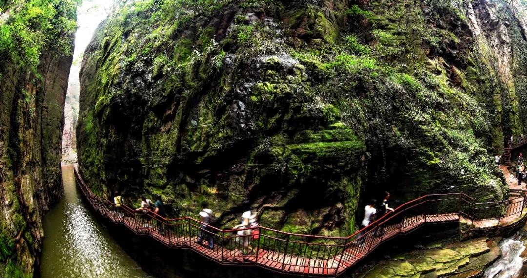 下圖我們可以看到兩側(cè)峭壁直立,壁高約50 m,長約20 m,谷寬僅1~3 m,抬頭僅見天空一線,為峽谷內(nèi)最窄的地方;谷內(nèi)積水成潭,水深約4~5m,因處深谷,很少得到陽光的照射,顏色深遂發(fā)暗,因此稱黑龍關(guān),潭叫黑龍?zhí)丁?/p>