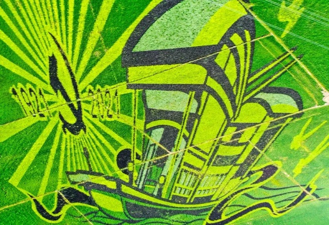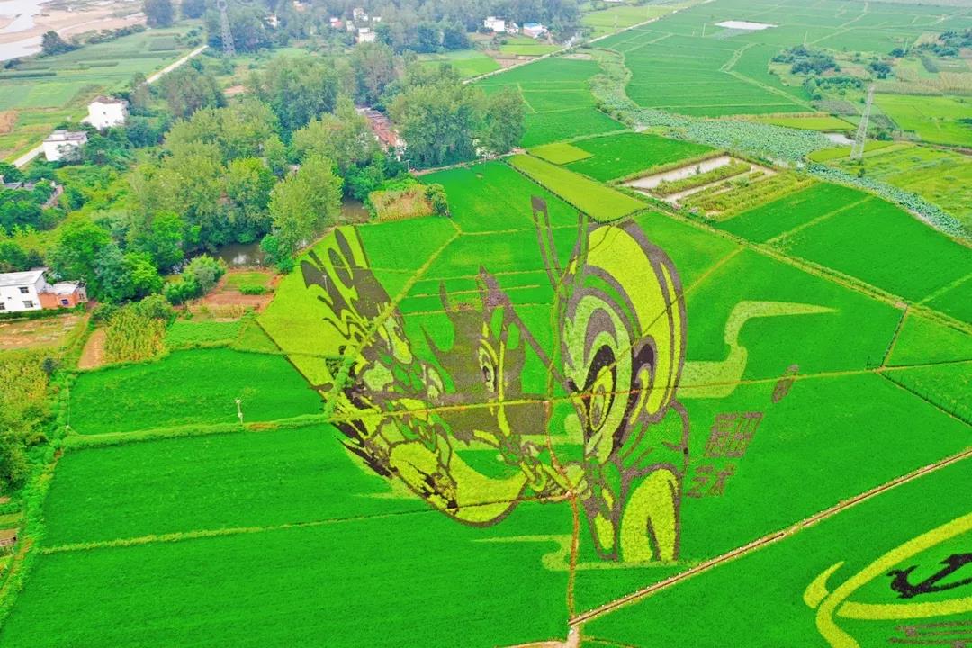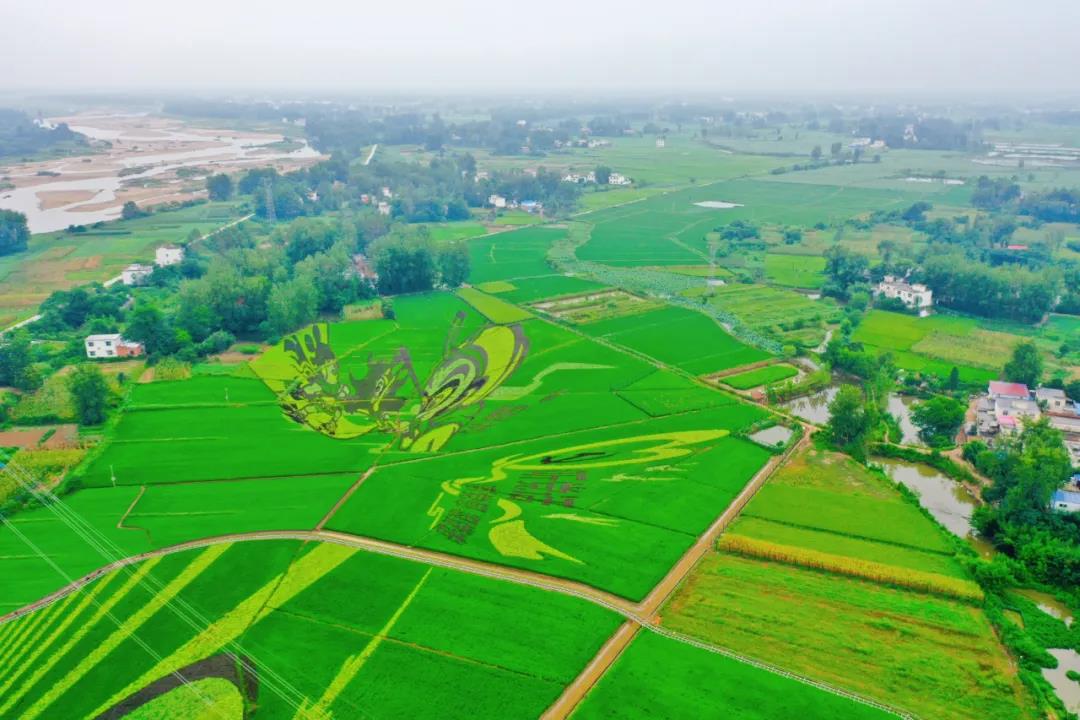 大別山農(nóng)業(yè)藝術(shù)公社一大片彩色稻田翻起稻浪,