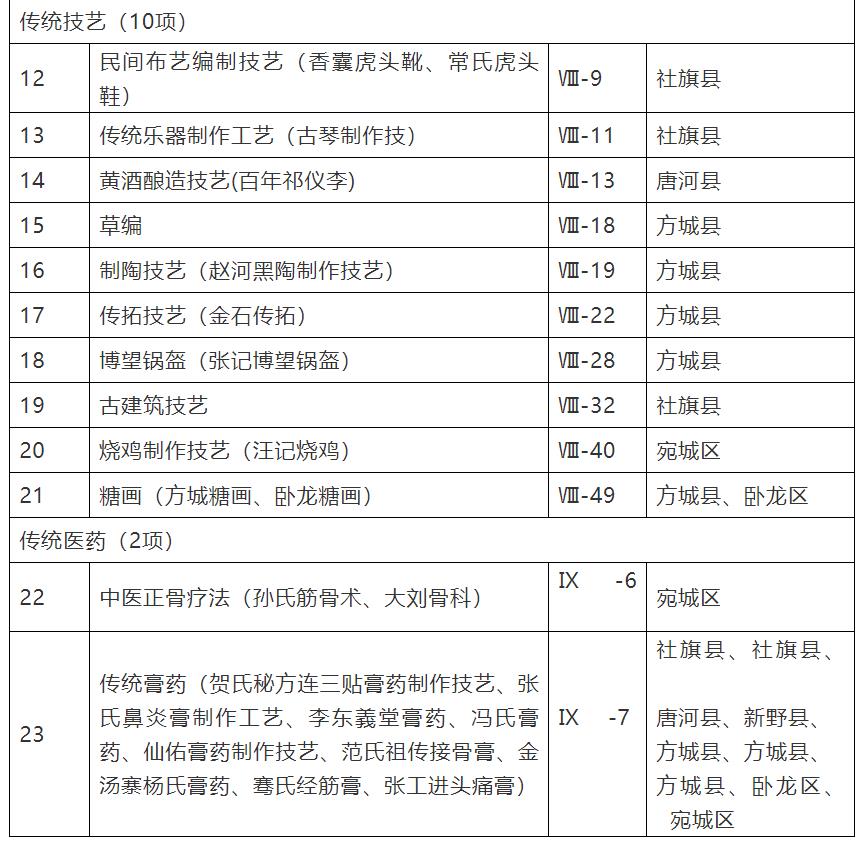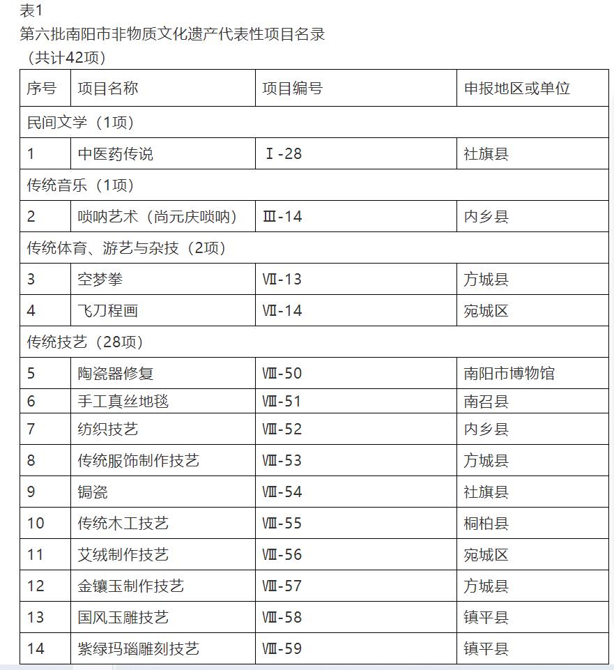 為深入貫徹習(xí)近平新時(shí)代中國特色社會(huì)主義思想,進(jìn)一步加強(qiáng)市級非物質(zhì)文化遺產(chǎn)代表性項(xiàng)目名錄建設(shè),根據(jù)《中華人民共和國非物質(zhì)文化遺產(chǎn)法》《河南省非物質(zhì)文化遺產(chǎn)保護(hù)條例》,自今年3月份開始,南陽市文化廣電和旅游局開展了第六批南陽市市級非物質(zhì)文化遺產(chǎn)代表性項(xiàng)目申報(bào)工作。經(jīng)各地申報(bào)、專家評審、南陽市文化廣電和旅游局網(wǎng)站公示,南陽市人民政府公布了第六批南陽市非物質(zhì)文化遺產(chǎn)代表性項(xiàng)目名錄42項(xiàng)(見表1)和南陽市非物質(zhì)文化遺產(chǎn)代表性項(xiàng)目名錄擴(kuò)展項(xiàng)目名錄23項(xiàng)(見表2)。