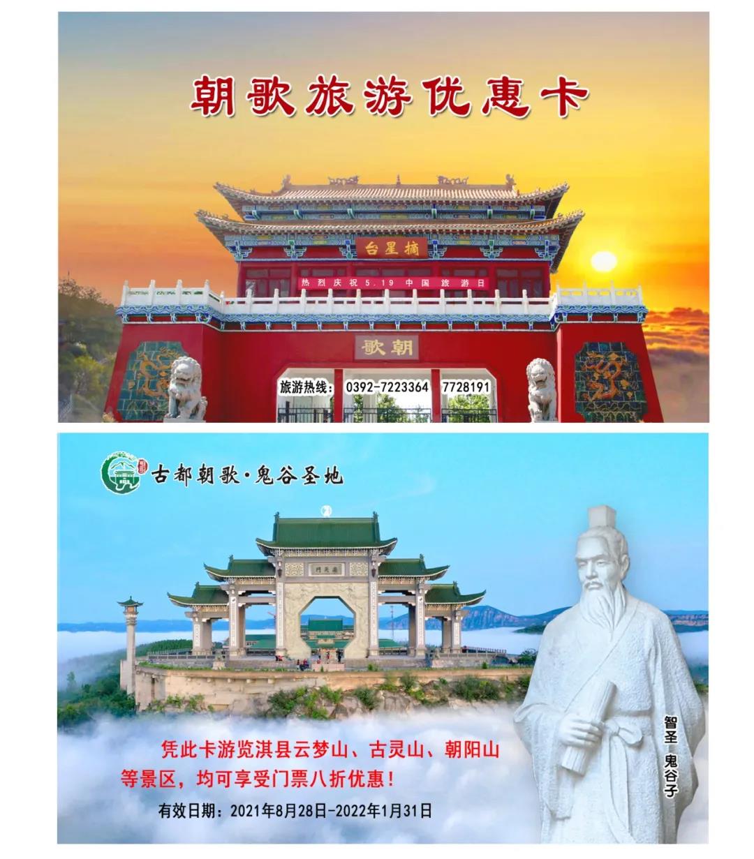 所有游客還可免費(fèi)獲贈(zèng)一張“朝歌旅游優(yōu)惠卡”,憑卡下次游覽淇縣云夢(mèng)山、古靈山、朝陽(yáng)山等景區(qū),均可享受門票八折優(yōu)惠。