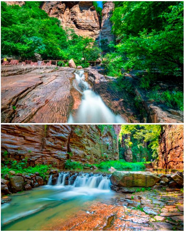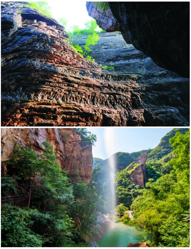 龍?zhí)洞髰{谷景區(qū)是以紫紅色石英砂巖為主要構(gòu)成的一條U形峽谷,谷內(nèi)關(guān)峽相望,潭瀑聯(lián)珠,壁立萬仞,激流飛濺,嶂谷、隘谷呈串珠狀分布,不同時期的流水切割、旋蝕、磨痕十分清晰,是全國科普教育基地。