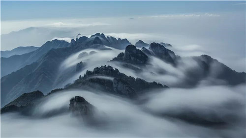 云海在群巒中若隱若現(xiàn)、宛若仙境,青山像是失去了顏色,像極了畫卷上那揮揮灑灑的水墨畫,唯美壯觀。