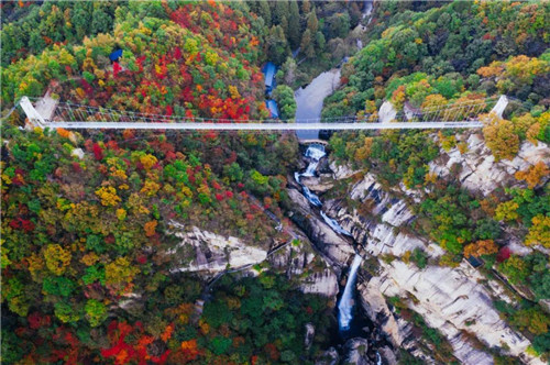 九龍?zhí)鞓蛐藿ㄔ诤0?500米左右的峽谷之上,千米天塹一線牽,腳踩懸空一千多米的玻璃天橋,山風(fēng)自峽谷而起,耳畔是瀑布流水聲,憑欄遠(yuǎn)眺,讓人心胸開闊,不禁想大聲吶喊,釋放心中壓力。