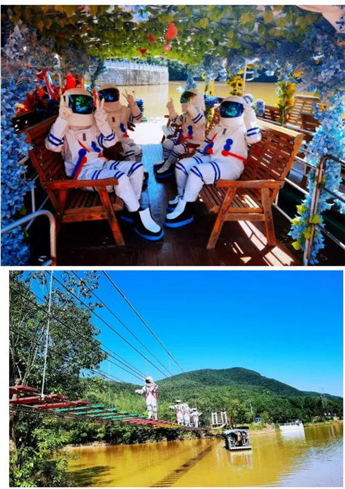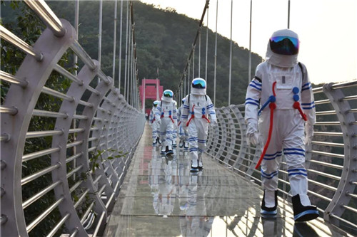 央視新聞說,太空出差“三人組”要回來過中秋啦,神秘“宇航員”突降九峰山,他們給我們帶來了,科幻的太空舞,他們游玩步步驚心橋、游船、高空玻璃橋……