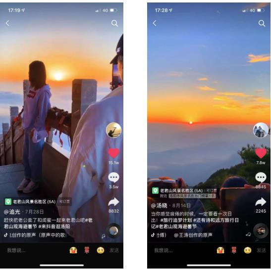 2020年抖音數(shù)據(jù)報告顯示:定位為老君山風景名勝區(qū)的短視頻,總瀏覽量達 25億;相比2019年的6.4億增加了18.6億的瀏覽量;通過持續(xù)不斷的宣傳發(fā)酵,老君山的云海盛景、日出、日落、一元午餐、金殿、雪景、霧凇等項目火遍抖音,吸引無數(shù)游客打卡體驗,長期霸屏2020抖音旅行榜TOP1、洛陽市風景名勝熱門榜TOP1;成為2020年度,當之無愧的抖音最火景區(qū)。