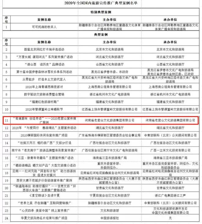 近日,文化和旅游部資源開發(fā)司發(fā)布2020年國內(nèi)旅游宣傳推廣典型案例名單,24個案例入選。“彎道超車 創(chuàng)造奇跡”——2020老君山宣傳推廣案例位列其中。