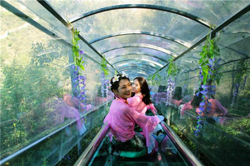 2、玻璃滑道:3D全透明玻璃滑道,滑道長188米,自我掌控,順著山勢穿梭于密林之中,安全、好玩,票價20元。