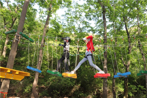 4、叢林穿越:它是在樹木之間建設(shè)了一條具有多種障礙、獨特關(guān)卡的挑戰(zhàn)線路,由懸空橋梁、步道、鎖鏈等趣味環(huán)節(jié)組成,每條線路約為300米,適合家庭親子體驗。票價20元。