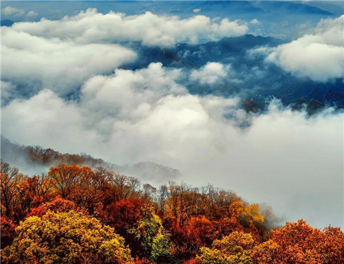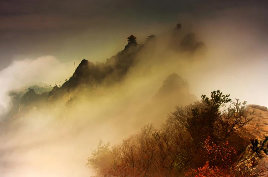 成團的云霧從山澗騰出,一會兒像小獸,在山頭上打滾兒玩鬧,一會兒如白龍,在山澗飛出,沖入云霄,若隱若現(xiàn)的金頂?shù)烙^群,與五彩斑斕的山色,構(gòu)成了一幅撩動人心的美好畫卷。