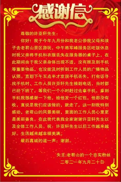 2021年9月26日,老君山景區(qū)收到一份感謝信,感謝信中“忠實(shí)粉絲”除了夸贊“老君山景區(qū)的風(fēng)景美麗,還對(duì)景區(qū)工作人員的工作表示認(rèn)同和感謝!