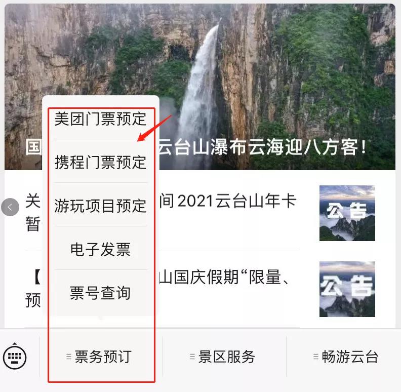 “云臺山景區(qū)”官方微信公眾號,預(yù)約票務(wù),輕松入園。