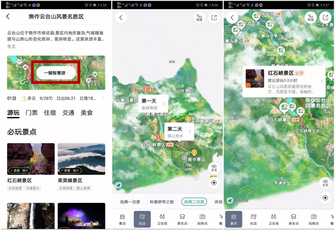 打開高德地圖APP搜索云臺山“一鍵智慧游”,線路玩法、景點推薦,各項需求輕松到位。