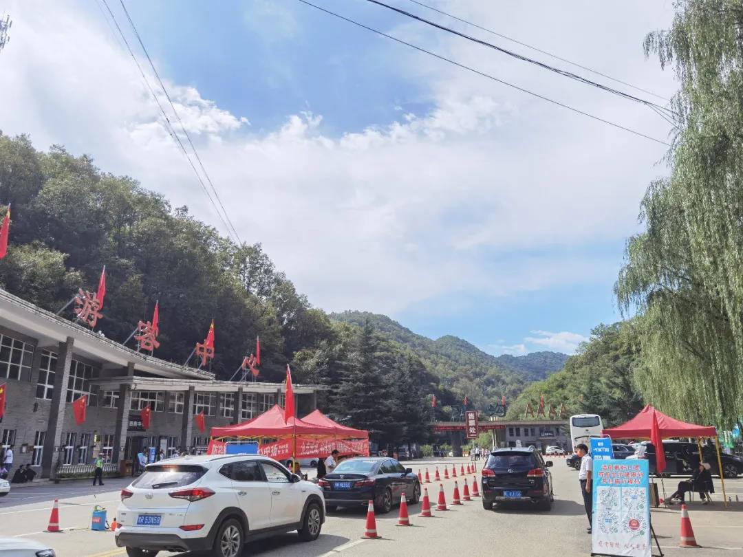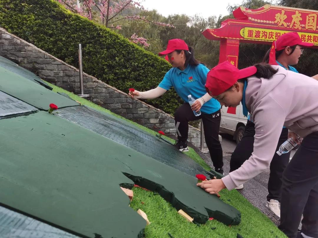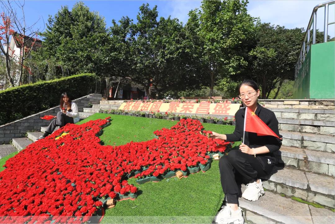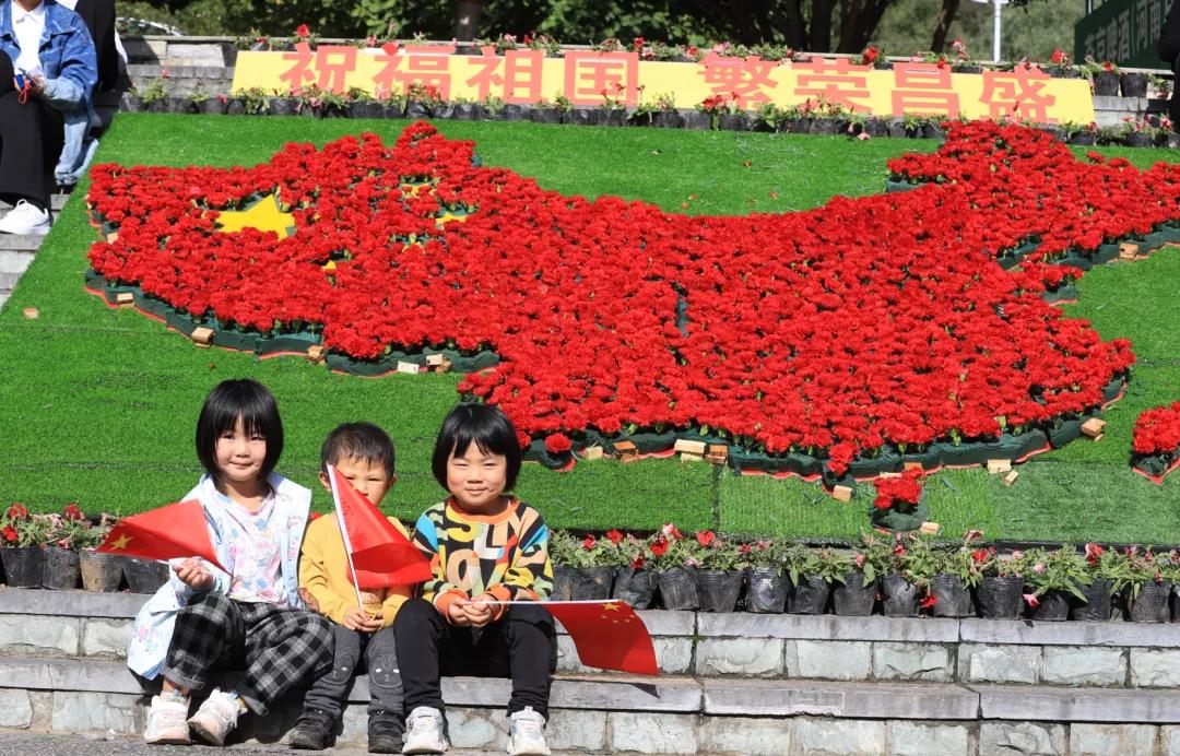 在重渡溝3號停車場,游客用數(shù)千支康乃馨組合而成的“中國地圖”最為搶眼,在陽光的照射下,分外耀眼,左上角五顆黃色的五角星熠熠閃光,象征各個民族團結(jié)一心,共筑“中國夢”。