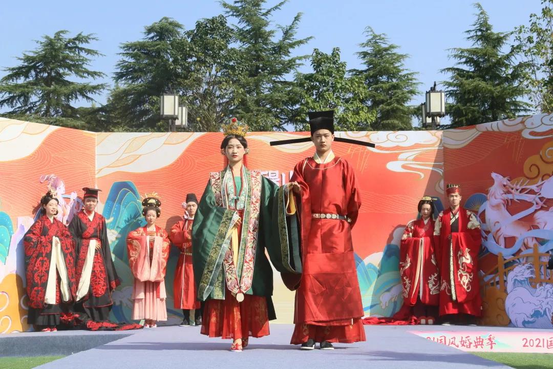 除了盛大隆重的漢代婚禮演繹,在景區(qū)漢博苑廣場(chǎng),還有眾多國(guó)風(fēng)達(dá)人身著各色朝代貴族婚服進(jìn)行場(chǎng)景化展示,包括周制、宋制、唐制、明制等,讓廣大游客了解到不同時(shí)期的婚服特點(diǎn)及其原由,在差異中看到傳統(tǒng)文化的兼容并包和發(fā)展變化,成為假期間備受游客關(guān)注的演繹項(xiàng)。