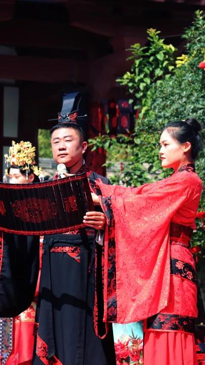 假期當(dāng)天,芒碭山旅游區(qū)迎來(lái)了多位前來(lái)體驗(yàn)漢婚禮的新人,他們?cè)谶@里身著正統(tǒng)漢代婚服,牽手步入華堂,一起在這特殊的日子里體驗(yàn)最傳統(tǒng)漢式婚禮。