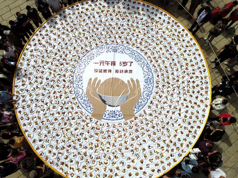 現(xiàn)場人們自覺排隊(duì),只見桌子上放著一個完全敞開口的收款箱,卻是無人值守,收款箱上寫著“無人值守,自覺投幣,自助找零”,也可以在收款箱上掃碼支付,支付環(huán)節(jié)全程無人值守,全憑自覺,現(xiàn)場民眾秩序井然。主辦方坦然,因?yàn)榻衲晔菄鴳c一元午餐的第五個年頭了,將往年游客多給的錢購買了當(dāng)?shù)氐耐岭u蛋制作成茶葉蛋,來慶祝一元午餐的五周歲生日,同時也豐富一下一元午餐這份“簡單”的午餐。一元午餐倡導(dǎo)節(jié)儉拒絕浪費(fèi),現(xiàn)場布置的環(huán)境和宣傳展板上貼著“節(jié)約糧食拒絕浪費(fèi)”的標(biāo)識,開餐前大家一起誦讀《憫農(nóng)》,“鋤禾日當(dāng)午,汗滴禾下土,誰知盤中餐,粒粒皆辛苦”,