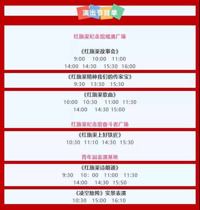 每天近30場(chǎng)演出,紅旗渠故事會(huì)、歌曲聯(lián)唱、實(shí)景演出、情景表演、詩(shī)朗誦......超多精彩,千萬(wàn)別錯(cuò)過(guò)!