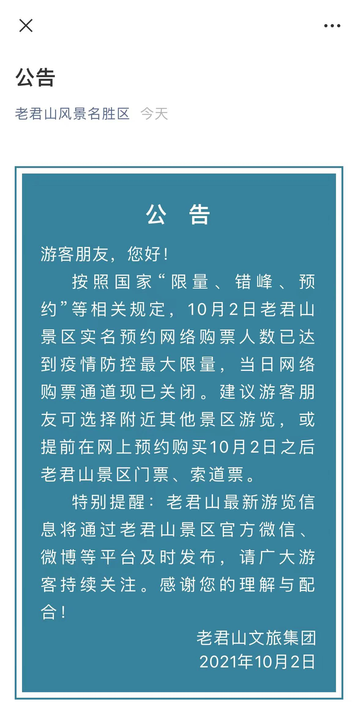 凌晨6點(diǎn)左右,網(wǎng)上預(yù)約人數(shù)已接近疫情防控要求的最大限流標(biāo)準(zhǔn),景區(qū)第一時(shí)間在微信公眾號(hào)、景區(qū)大屏對(duì)外發(fā)布停止售票公告。建議游客先到附近其他景區(qū)游覽,及時(shí)對(duì)游客進(jìn)行分流、疏導(dǎo)。