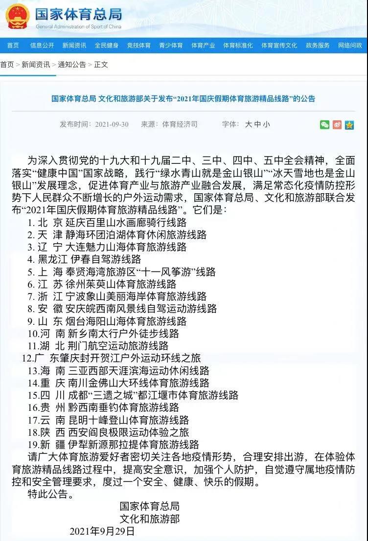 為全面落實(shí)“健康中國(guó)”國(guó)家戰(zhàn)略,踐行“綠水青山就是金山銀山”的發(fā)展理念,促進(jìn)體育產(chǎn)業(yè)與旅游產(chǎn)業(yè)融合發(fā)展,滿足常態(tài)化疫情防控形勢(shì)下人民群眾不斷增長(zhǎng)的戶外運(yùn)動(dòng)需求,值2021年國(guó)慶佳節(jié)來(lái)臨之際,國(guó)家體育總局、文化和旅游部聯(lián)合發(fā)布“2021年國(guó)慶假期體育旅游精品線路”。