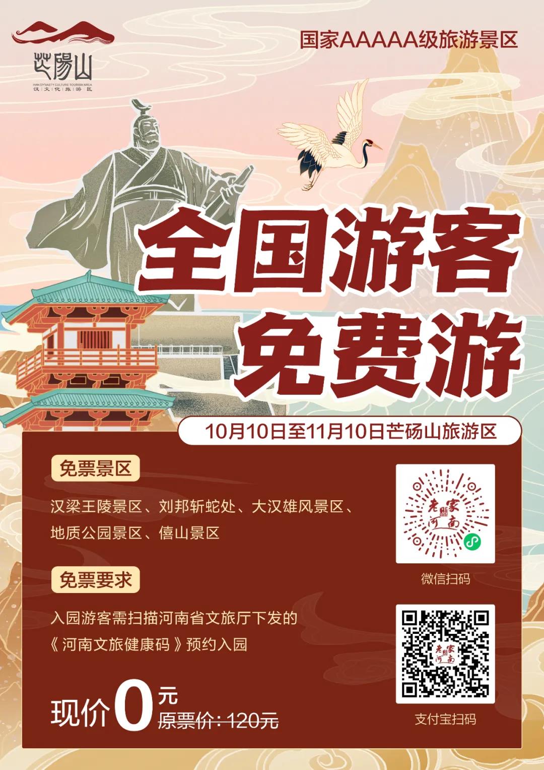 為積極響應(yīng)老家河南秋季惠民政策,答謝各地游客對(duì)芒碭山旅游區(qū)長(zhǎng)期以來(lái)的支持與厚愛(ài)。自2021年10月10日至11月10日,芒碭山旅游區(qū)將對(duì)全國(guó)人民實(shí)行“一個(gè)月免門(mén)票”活動(dòng)。