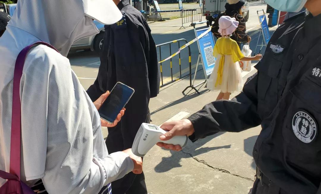 在景區(qū)入口設(shè)置有疫情防控出入通道,提醒游客佩戴口罩,出示健康碼、測(cè)量體溫,保持間距,來(lái)自五湖四海的游客遵守常態(tài)化疫情防控規(guī)定,暢享山水之間。