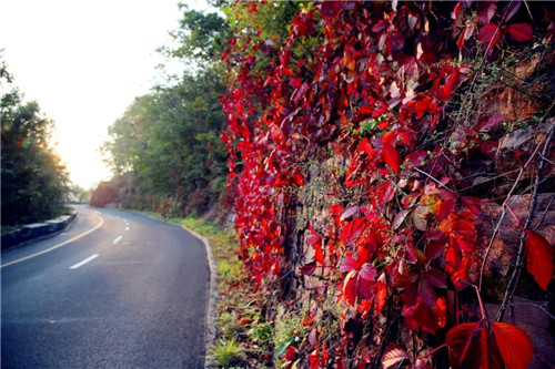 山崖峭壁上,一條蜿蜒曲折的公路如盤云的游龍,在樹木點綴下形態(tài)畢現(xiàn),如火似錦正是看紅葉的好時節(jié)。