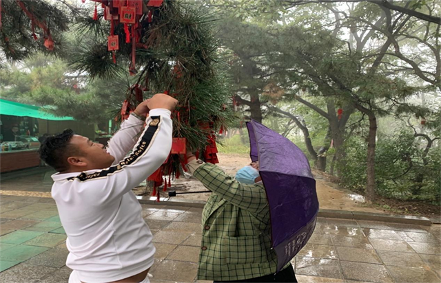 一大早,景區(qū)內(nèi)到處可見銀發(fā)老人們和子女們舉家出游的歡樂畫面。在二祖庵祈福樹前,有很多游客將許愿牌掛到祈福樹上并拍照留念,來自南陽的王先生在煉魔臺、鳳凰石等多處祈福地點(diǎn)和家人拍下了溫馨的全家福。王先生說,自己常年在外奔波無暇顧及家中父母,他在無意間在網(wǎng)絡(luò)上看到了少林景區(qū)重陽節(jié)登高祈福的活動,自己的父母也沒有來過少林景區(qū),并且乘坐嵩山索道可以享受半價優(yōu)惠。于是就借此機(jī)會,趁著重陽節(jié)錯峰出游帶著父母來到少林景區(qū)來看一看,也算盡一盡自己的孝道。