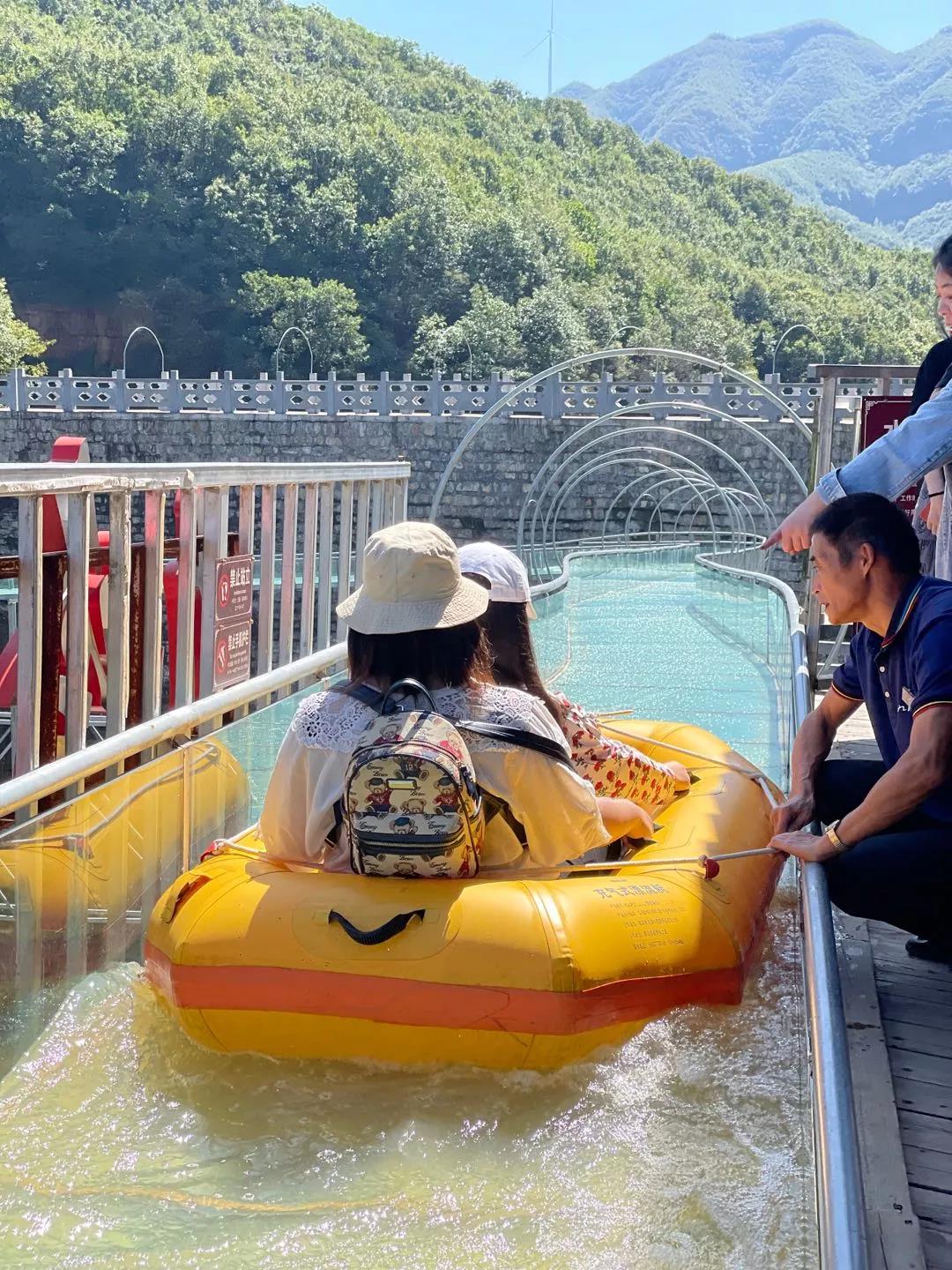 雙人坐漂流艇順著玻璃滑道上的水流滑下去,