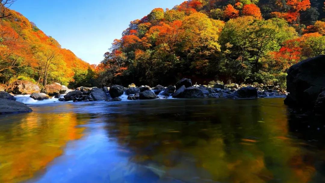 峽谷的秋景絢麗多姿,層林浸染,秋越濃,這里的顏色就越鮮艷,放眼望去,錯(cuò)落有致的山林與溪流若隱若現(xiàn),與紅葉彩林相映成趣。
