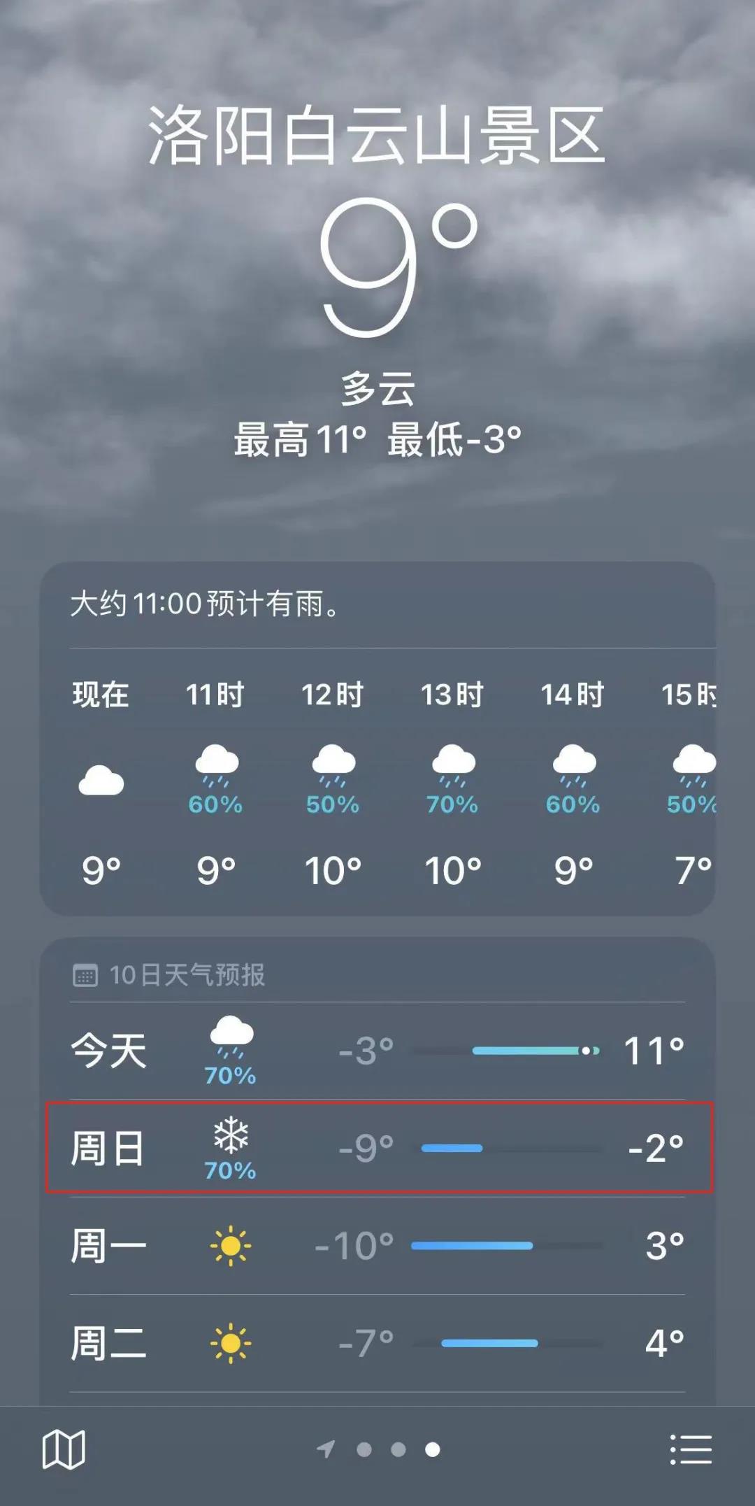根據(jù)氣象臺(tái)預(yù)測(cè):11月6日夜間到11月7日,洛陽(yáng)白云山將會(huì)迎來(lái)降雪降溫天氣。