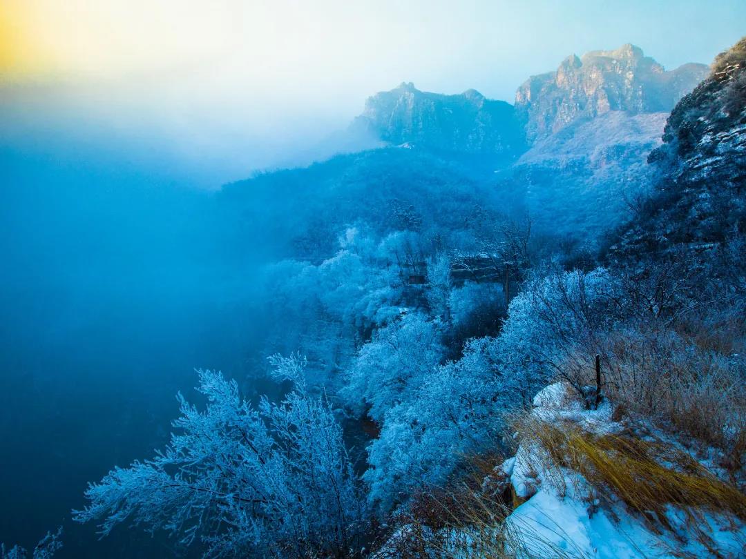 銀色里透著墨綠,枝條上掛滿結(jié)晶,晶瑩潔白,一塵不染,就像溫柔的少女,晶瑩剔透,楚楚動(dòng)人,而凝結(jié)在峭壁懸崖上的,宛如飛流直下的瀑布,尤為壯觀,花草樹木披上了節(jié)日盛裝,垂柳蒼松, 凝霜掛雪 , 如朵朵白云,一切變得如夢似幻、隆重而圣潔。
