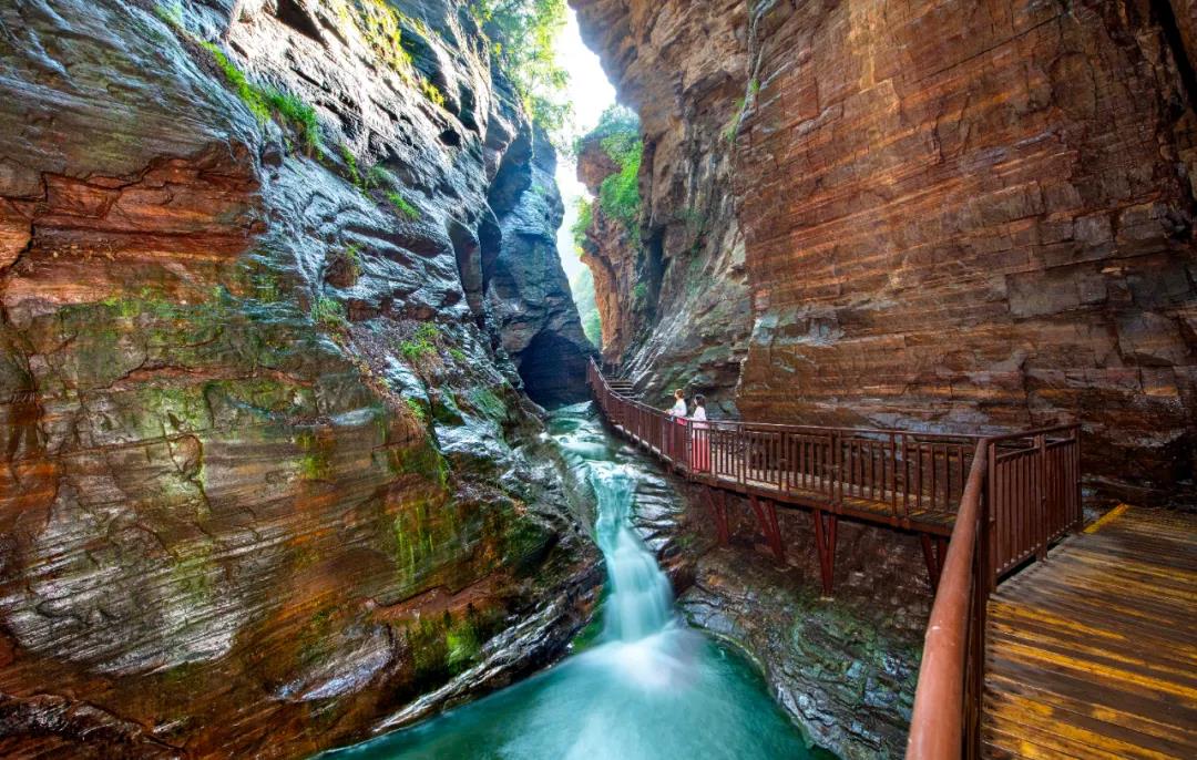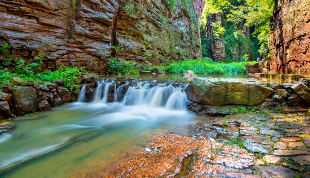 峽谷內(nèi)有紅巖絕壁、飛瀑流泉、溪魚風(fēng)鳥