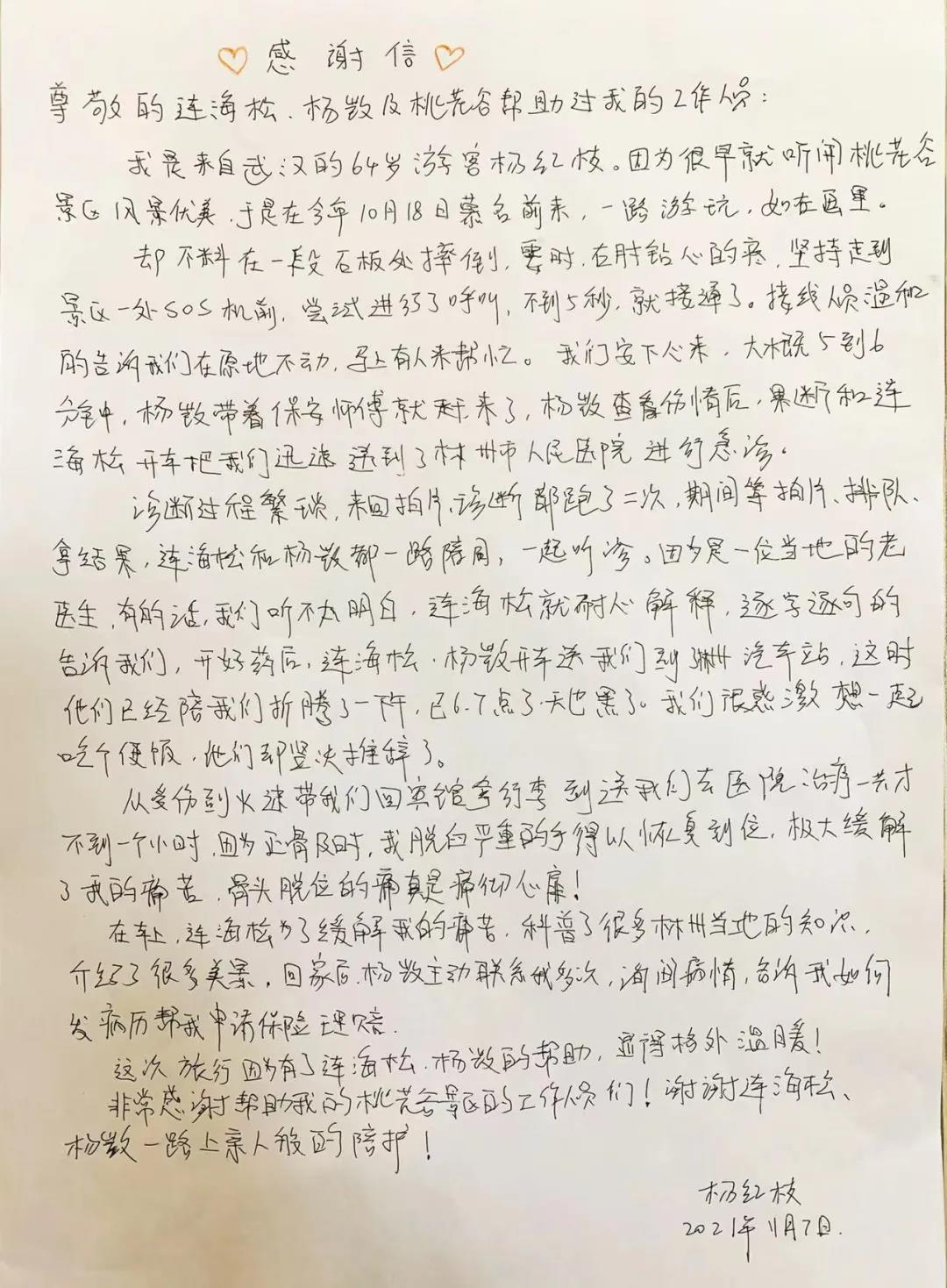 信里寫(xiě)到,事情發(fā)生在2021年10月18日,武漢游客在景區(qū)游覽途中把肘摔傷,景區(qū)工作人員楊凱接到消息后叮囑游客在原地不動(dòng),和景區(qū)工作人員迅速到達(dá)事發(fā)地點(diǎn)展開(kāi)救援,楊凱和連海松開(kāi)車(chē)將游客送到林州市中醫(yī)院救治,在診斷過(guò)程中楊凱和連海松全程陪同……