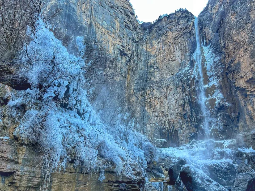 隨著氣溫下降,云臺(tái)天瀑形成冰瀑景觀,霜花飛濺,霧珠凝結(jié),層層疊疊,錯(cuò)落有致,宛若銀河倒掛。